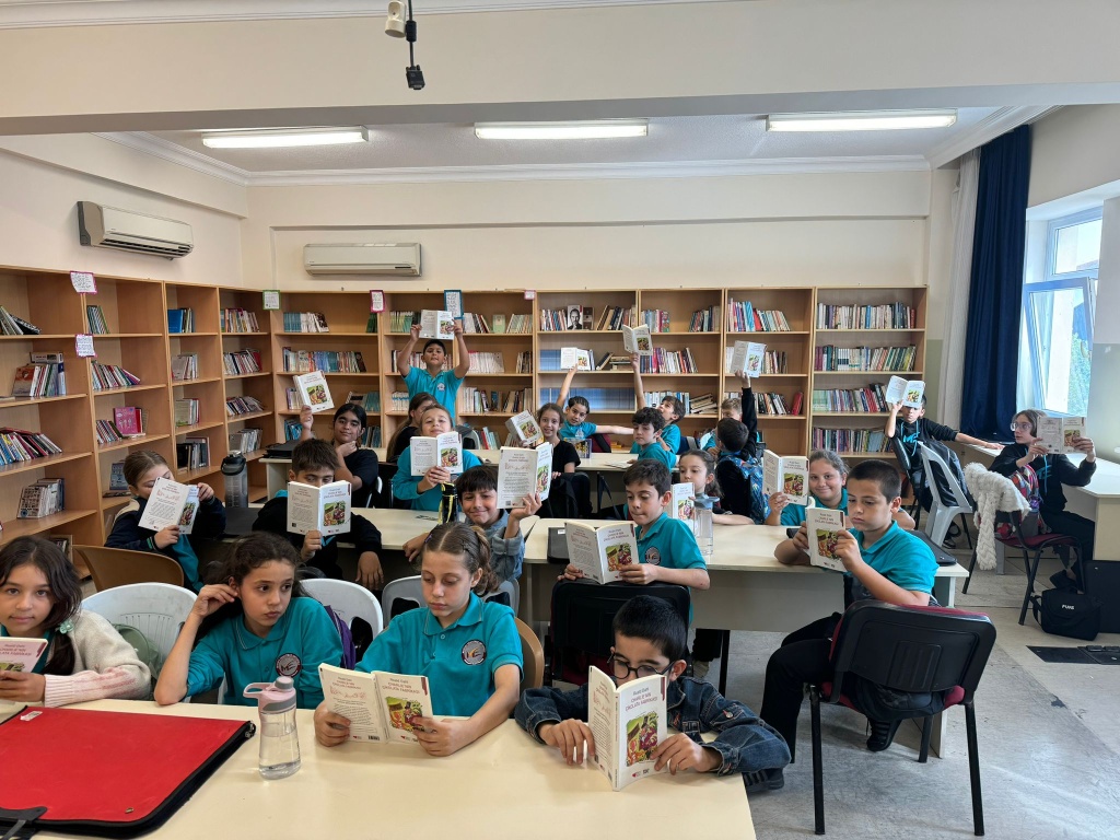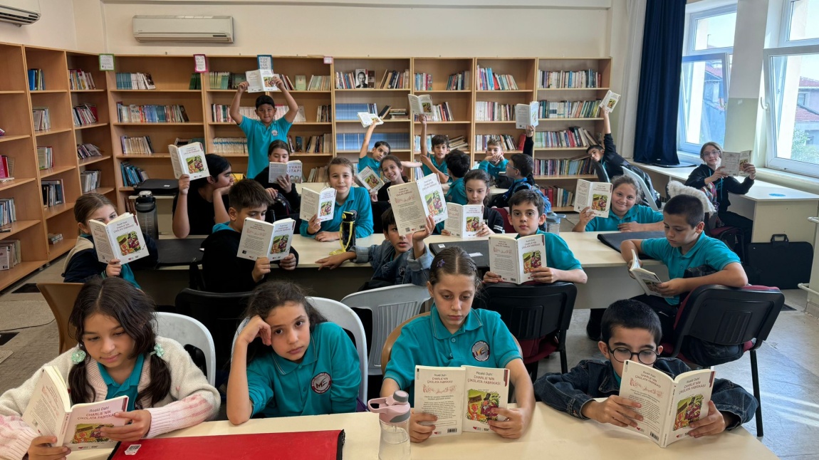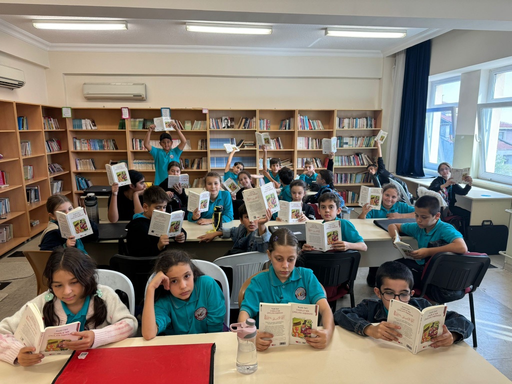 5/B sınıfı okul kütüphanesinde keyifle kitap okumanın zevkini tadıyor.